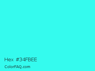 Hex #34fbee Color is a normal cyan color and the nearest color is Loeen #15f2fd. Hex code #34fbee and RGB value is rgb(52,251,238). In RGB color space, this color is composed of 20% red, 98% green, 93% blue, In CMYK color space, this color is composed of 79% cyan, 0% magenta, 5% yellow , 2% black , In HSL color space, this color has a hue angle of 176° , 96% saturation and 59% lightness.