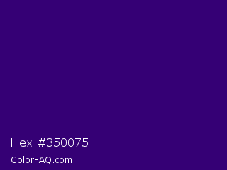 Hex #350075 Color is a dark violet color and the nearest color is Blue Diamond #380474. Hex code #350075 and RGB value is rgb(53,0,117). In RGB color space, this color is composed of 21% red, 0% green, 46% blue, In CMYK color space, this color is composed of 55% cyan, 100% magenta, 0% yellow , 54% black , In HSL color space, this color has a hue angle of 267° , 100% saturation and 23% lightness.