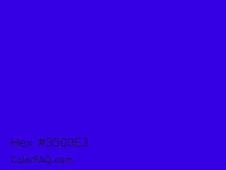 Hex #3500e3 Color is a normal indigo color and the nearest color is Interdimensional Blue #360ccc. Hex code #3500e3 and RGB value is rgb(53,0,227). In RGB color space, this color is composed of 21% red, 0% green, 89% blue, In CMYK color space, this color is composed of 77% cyan, 100% magenta, 0% yellow , 11% black , In HSL color space, this color has a hue angle of 254° , 100% saturation and 45% lightness.
