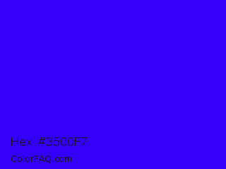 Hex #3500f7 Color is a normal indigo color and the nearest color is Electric Ultramarine #3f00ff. Hex code #3500f7 and RGB value is rgb(53,0,247). In RGB color space, this color is composed of 21% red, 0% green, 97% blue, In CMYK color space, this color is composed of 79% cyan, 100% magenta, 0% yellow , 3% black , In HSL color space, this color has a hue angle of 253° , 100% saturation and 48% lightness.
