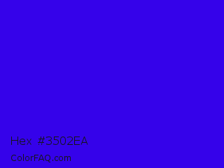 Hex #3502ea Color is a normal indigo color and the nearest color is Electric Ultramarine #3f00ff. Hex code #3502ea and RGB value is rgb(53,2,234). In RGB color space, this color is composed of 21% red, 1% green, 92% blue, In CMYK color space, this color is composed of 77% cyan, 99% magenta, 0% yellow , 8% black , In HSL color space, this color has a hue angle of 253° , 98% saturation and 46% lightness.
