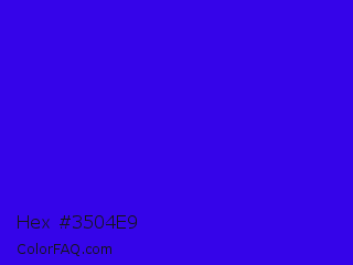 Hex #3504e9 Color is a normal indigo color and the nearest color is Electric Ultramarine #3f00ff. Hex code #3504e9 and RGB value is rgb(53,4,233). In RGB color space, this color is composed of 21% red, 2% green, 91% blue, In CMYK color space, this color is composed of 77% cyan, 98% magenta, 0% yellow , 9% black , In HSL color space, this color has a hue angle of 253° , 97% saturation and 46% lightness.