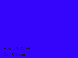 Hex #3504fb Color is a normal indigo color and the nearest color is Electric Ultramarine #3f00ff. Hex code #3504fb and RGB value is rgb(53,4,251). In RGB color space, this color is composed of 21% red, 2% green, 98% blue, In CMYK color space, this color is composed of 79% cyan, 98% magenta, 0% yellow , 2% black , In HSL color space, this color has a hue angle of 252° , 97% saturation and 50% lightness.