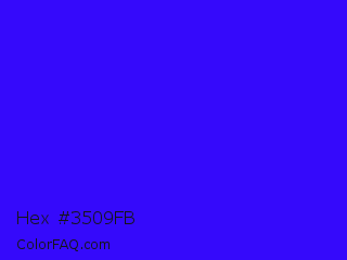Hex #3509fb Color is a normal indigo color and the nearest color is Electric Ultramarine #3f00ff. Hex code #3509fb and RGB value is rgb(53,9,251). In RGB color space, this color is composed of 21% red, 4% green, 98% blue, In CMYK color space, this color is composed of 79% cyan, 96% magenta, 0% yellow , 2% black , In HSL color space, this color has a hue angle of 251° , 97% saturation and 51% lightness.