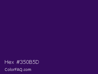 Hex #350b5d Color is a very dark purple color and the nearest color is Jagger #350e57. Hex code #350b5d and RGB value is rgb(53,11,93). In RGB color space, this color is composed of 21% red, 4% green, 36% blue, In CMYK color space, this color is composed of 43% cyan, 88% magenta, 0% yellow , 64% black , In HSL color space, this color has a hue angle of 271° , 79% saturation and 20% lightness.
