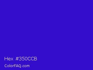 Hex #350ccb Color is a normal indigo color and the nearest color is Interdimensional Blue #360ccc. Hex code #350ccb and RGB value is rgb(53,12,203). In RGB color space, this color is composed of 21% red, 5% green, 80% blue, In CMYK color space, this color is composed of 74% cyan, 94% magenta, 0% yellow , 20% black , In HSL color space, this color has a hue angle of 253° , 89% saturation and 42% lightness.