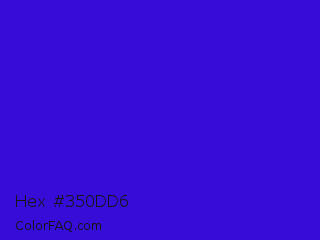 Hex #350dd6 Color is a normal indigo color and the nearest color is Interdimensional Blue #360ccc. Hex code #350dd6 and RGB value is rgb(53,13,214). In RGB color space, this color is composed of 21% red, 5% green, 84% blue, In CMYK color space, this color is composed of 75% cyan, 94% magenta, 0% yellow , 16% black , In HSL color space, this color has a hue angle of 252° , 89% saturation and 45% lightness.