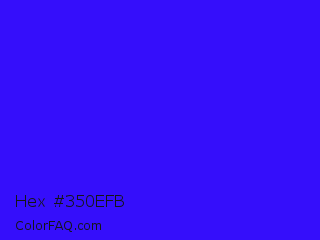 Hex #350efb Color is a normal indigo color and the nearest color is Electric Ultramarine #3f00ff. Hex code #350efb and RGB value is rgb(53,14,251). In RGB color space, this color is composed of 21% red, 5% green, 98% blue, In CMYK color space, this color is composed of 79% cyan, 94% magenta, 0% yellow , 2% black , In HSL color space, this color has a hue angle of 250° , 97% saturation and 52% lightness.