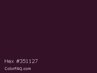 Hex #351127 Color is a very dark magenta color and the nearest color is Melanzane #300529. Hex code #351127 and RGB value is rgb(53,17,39). In RGB color space, this color is composed of 21% red, 7% green, 15% blue, In CMYK color space, this color is composed of 0% cyan, 68% magenta, 26% yellow , 79% black , In HSL color space, this color has a hue angle of 323° , 51% saturation and 14% lightness.