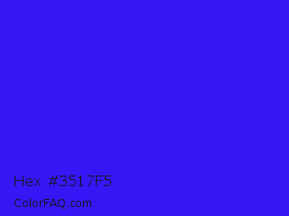 Hex #3517f5 Color is a normal indigo color and the nearest color is Bluebonnet #1c1cf0. Hex code #3517f5 and RGB value is rgb(53,23,245). In RGB color space, this color is composed of 21% red, 9% green, 96% blue, In CMYK color space, this color is composed of 78% cyan, 91% magenta, 0% yellow , 4% black , In HSL color space, this color has a hue angle of 248° , 92% saturation and 53% lightness.