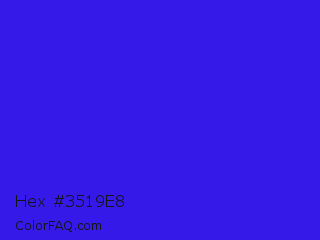 Hex #3519e8 Color is a normal indigo color and the nearest color is Bluebonnet #1c1cf0. Hex code #3519e8 and RGB value is rgb(53,25,232). In RGB color space, this color is composed of 21% red, 10% green, 91% blue, In CMYK color space, this color is composed of 77% cyan, 89% magenta, 0% yellow , 9% black , In HSL color space, this color has a hue angle of 248° , 82% saturation and 50% lightness.