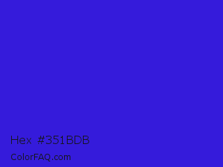 Hex #351bdb Color is a normal indigo color and the nearest color is Interdimensional Blue #360ccc. Hex code #351bdb and RGB value is rgb(53,27,219). In RGB color space, this color is composed of 21% red, 11% green, 86% blue, In CMYK color space, this color is composed of 76% cyan, 88% magenta, 0% yellow , 14% black , In HSL color space, this color has a hue angle of 248° , 78% saturation and 48% lightness.