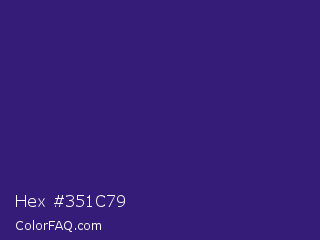 Hex #351c79 Color is a dark indigo color and the nearest color is Meteorite #3c1f76. Hex code #351c79 and RGB value is rgb(53,28,121). In RGB color space, this color is composed of 21% red, 11% green, 47% blue, In CMYK color space, this color is composed of 56% cyan, 77% magenta, 0% yellow , 53% black , In HSL color space, this color has a hue angle of 256° , 62% saturation and 29% lightness.