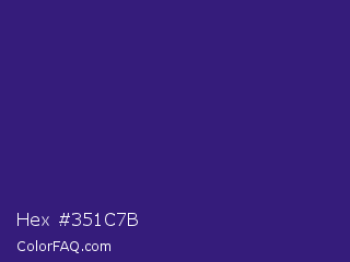 Hex #351c7b Color is a dark indigo color and the nearest color is Meteorite #3c1f76. Hex code #351c7b and RGB value is rgb(53,28,123). In RGB color space, this color is composed of 21% red, 11% green, 48% blue, In CMYK color space, this color is composed of 57% cyan, 77% magenta, 0% yellow , 52% black , In HSL color space, this color has a hue angle of 256° , 63% saturation and 30% lightness.