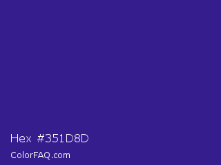 Hex #351d8d Color is a normal indigo color and the nearest color is Pixie Powder #391285. Hex code #351d8d and RGB value is rgb(53,29,141). In RGB color space, this color is composed of 21% red, 11% green, 55% blue, In CMYK color space, this color is composed of 62% cyan, 79% magenta, 0% yellow , 45% black , In HSL color space, this color has a hue angle of 253° , 66% saturation and 33% lightness.