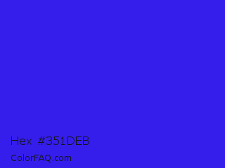 Hex #351deb Color is a normal indigo color and the nearest color is Bluebonnet #1c1cf0. Hex code #351deb and RGB value is rgb(53,29,235). In RGB color space, this color is composed of 21% red, 11% green, 92% blue, In CMYK color space, this color is composed of 77% cyan, 88% magenta, 0% yellow , 8% black , In HSL color space, this color has a hue angle of 247° , 84% saturation and 52% lightness.