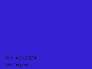 Hex #3520d4 Color is a normal indigo color and the nearest color is Interdimensional Blue #360ccc. Hex code #3520d4 and RGB value is rgb(53,32,212). In RGB color space, this color is composed of 21% red, 13% green, 83% blue, In CMYK color space, this color is composed of 75% cyan, 85% magenta, 0% yellow , 17% black , In HSL color space, this color has a hue angle of 247° , 74% saturation and 48% lightness.