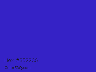 Hex #3522c6 Color is a normal indigo color and the nearest color is Interdimensional Blue #360ccc. Hex code #3522c6 and RGB value is rgb(53,34,198). In RGB color space, this color is composed of 21% red, 13% green, 78% blue, In CMYK color space, this color is composed of 73% cyan, 83% magenta, 0% yellow , 22% black , In HSL color space, this color has a hue angle of 247° , 71% saturation and 45% lightness.