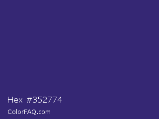 Hex #352774 Color is a dark indigo color and the nearest color is Meteorite #3c1f76. Hex code #352774 and RGB value is rgb(53,39,116). In RGB color space, this color is composed of 21% red, 15% green, 45% blue, In CMYK color space, this color is composed of 54% cyan, 66% magenta, 0% yellow , 55% black , In HSL color space, this color has a hue angle of 251° , 50% saturation and 30% lightness.