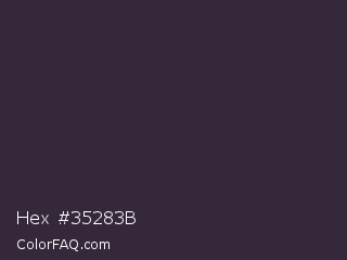 Hex #35283b Color is a very dark purple color and the nearest color is Blackcurrant #32293a. Hex code #35283b and RGB value is rgb(53,40,59). In RGB color space, this color is composed of 21% red, 16% green, 23% blue, In CMYK color space, this color is composed of 10% cyan, 32% magenta, 0% yellow , 77% black , In HSL color space, this color has a hue angle of 281° , 19% saturation and 19% lightness.