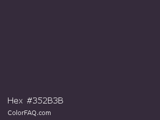 Hex #352b3b Color is a very dark purple color and the nearest color is Blackcurrant #32293a. Hex code #352b3b and RGB value is rgb(53,43,59). In RGB color space, this color is composed of 21% red, 17% green, 23% blue, In CMYK color space, this color is composed of 10% cyan, 27% magenta, 0% yellow , 77% black , In HSL color space, this color has a hue angle of 278° , 16% saturation and 20% lightness.