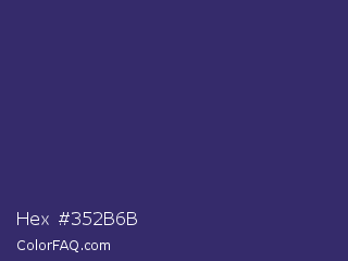 Hex #352b6b Color is a dark indigo color and the nearest color is Jacarta #3a2a6a. Hex code #352b6b and RGB value is rgb(53,43,107). In RGB color space, this color is composed of 21% red, 17% green, 42% blue, In CMYK color space, this color is composed of 50% cyan, 60% magenta, 0% yellow , 58% black , In HSL color space, this color has a hue angle of 249° , 43% saturation and 29% lightness.