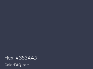 Hex #353a4d Color is a dark blue color and the nearest color is Martinique #363050. Hex code #353a4d and RGB value is rgb(53,58,77). In RGB color space, this color is composed of 21% red, 23% green, 30% blue, In CMYK color space, this color is composed of 31% cyan, 25% magenta, 0% yellow , 70% black , In HSL color space, this color has a hue angle of 228° , 18% saturation and 25% lightness.