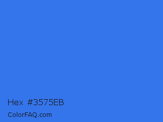 Hex #3575eb Color is a normal blue color and the nearest color is Royal Blue #4169e1. Hex code #3575eb and RGB value is rgb(53,117,235). In RGB color space, this color is composed of 21% red, 46% green, 92% blue, In CMYK color space, this color is composed of 77% cyan, 50% magenta, 0% yellow , 8% black , In HSL color space, this color has a hue angle of 219° , 82% saturation and 56% lightness.