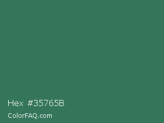Hex #35765b Color is a normal green color and the nearest color is Amazon #3b7a57. Hex code #35765b and RGB value is rgb(53,118,91). In RGB color space, this color is composed of 21% red, 46% green, 36% blue, In CMYK color space, this color is composed of 55% cyan, 0% magenta, 23% yellow , 54% black , In HSL color space, this color has a hue angle of 155° , 38% saturation and 34% lightness.