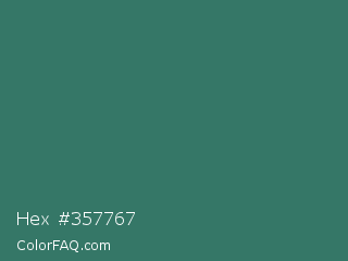 Hex #357767 Color is a normal cyan color and the nearest color is Myrtle Green #317873. Hex code #357767 and RGB value is rgb(53,119,103). In RGB color space, this color is composed of 21% red, 47% green, 40% blue, In CMYK color space, this color is composed of 55% cyan, 0% magenta, 13% yellow , 53% black , In HSL color space, this color has a hue angle of 165° , 38% saturation and 34% lightness.