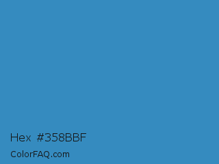 Hex #358bbf Color is a normal blue color and the nearest color is Boston Blue #3b91b4. Hex code #358bbf and RGB value is rgb(53,139,191). In RGB color space, this color is composed of 21% red, 55% green, 75% blue, In CMYK color space, this color is composed of 72% cyan, 27% magenta, 0% yellow , 25% black , In HSL color space, this color has a hue angle of 203° , 57% saturation and 48% lightness.