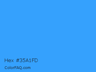 Hex #35a1fd Color is a normal blue color and the nearest color is Brilliant Azure #3399ff. Hex code #35a1fd and RGB value is rgb(53,161,253). In RGB color space, this color is composed of 21% red, 63% green, 99% blue, In CMYK color space, this color is composed of 79% cyan, 36% magenta, 0% yellow , 1% black , In HSL color space, this color has a hue angle of 208° , 98% saturation and 60% lightness.