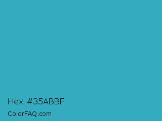 Hex #35abbf Color is a normal cyan color and the nearest color is Pelorous #3eabbf. Hex code #35abbf and RGB value is rgb(53,171,191). In RGB color space, this color is composed of 21% red, 67% green, 75% blue, In CMYK color space, this color is composed of 72% cyan, 10% magenta, 0% yellow , 25% black , In HSL color space, this color has a hue angle of 189° , 57% saturation and 48% lightness.