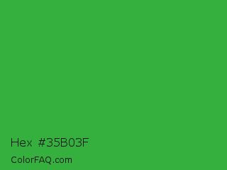 Hex #35b03f Color is a normal green color and the nearest color is Wageningen Green #34b233. Hex code #35b03f and RGB value is rgb(53,176,63). In RGB color space, this color is composed of 21% red, 69% green, 25% blue, In CMYK color space, this color is composed of 70% cyan, 0% magenta, 64% yellow , 31% black , In HSL color space, this color has a hue angle of 125° , 54% saturation and 45% lightness.