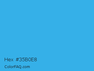 Hex #35b0e8 Color is a normal blue color and the nearest color is Picton Blue #45b1e8. Hex code #35b0e8 and RGB value is rgb(53,176,232). In RGB color space, this color is composed of 21% red, 69% green, 91% blue, In CMYK color space, this color is composed of 77% cyan, 24% magenta, 0% yellow , 9% black , In HSL color space, this color has a hue angle of 199° , 80% saturation and 56% lightness.