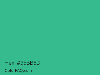 Hex #35bb8d Color is a normal green color and the nearest color is Mountain Meadow #30ba8f. Hex code #35bb8d and RGB value is rgb(53,187,141). In RGB color space, this color is composed of 21% red, 73% green, 55% blue, In CMYK color space, this color is composed of 72% cyan, 0% magenta, 25% yellow , 27% black , In HSL color space, this color has a hue angle of 159° , 56% saturation and 47% lightness.