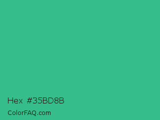 Hex #35bd8b Color is a normal green color and the nearest color is Mountain Meadow #30ba8f. Hex code #35bd8b and RGB value is rgb(53,189,139). In RGB color space, this color is composed of 21% red, 74% green, 55% blue, In CMYK color space, this color is composed of 72% cyan, 0% magenta, 26% yellow , 26% black , In HSL color space, this color has a hue angle of 158° , 56% saturation and 47% lightness.