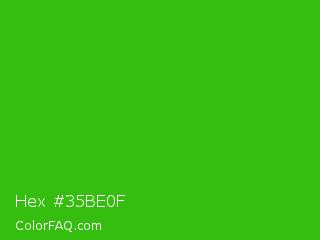 Hex #35be0f Color is a normal green color and the nearest color is Harlequin Green #46cb18. Hex code #35be0f and RGB value is rgb(53,190,15). In RGB color space, this color is composed of 21% red, 75% green, 6% blue, In CMYK color space, this color is composed of 72% cyan, 0% magenta, 92% yellow , 25% black , In HSL color space, this color has a hue angle of 107° , 85% saturation and 40% lightness.