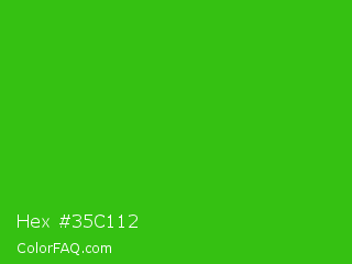 Hex #35c112 Color is a normal green color and the nearest color is Harlequin Green #46cb18. Hex code #35c112 and RGB value is rgb(53,193,18). In RGB color space, this color is composed of 21% red, 76% green, 7% blue, In CMYK color space, this color is composed of 73% cyan, 0% magenta, 91% yellow , 24% black , In HSL color space, this color has a hue angle of 108° , 83% saturation and 41% lightness.