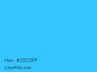 Hex #35c5ff Color is a normal blue color and the nearest color is Picton Blue #45b1e8. Hex code #35c5ff and RGB value is rgb(53,197,255). In RGB color space, this color is composed of 21% red, 77% green, 100% blue, In CMYK color space, this color is composed of 79% cyan, 23% magenta, 0% yellow , 0% black , In HSL color space, this color has a hue angle of 197° , 100% saturation and 60% lightness.