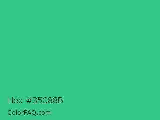 Hex #35c88b Color is a normal green color and the nearest color is Shamrock #33cc99. Hex code #35c88b and RGB value is rgb(53,200,139). In RGB color space, this color is composed of 21% red, 78% green, 55% blue, In CMYK color space, this color is composed of 74% cyan, 0% magenta, 31% yellow , 22% black , In HSL color space, this color has a hue angle of 155° , 58% saturation and 50% lightness.