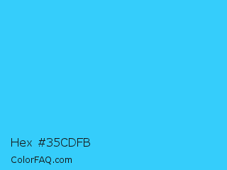 Hex #35cdfb Color is a normal blue color and the nearest color is Picton Blue #45b1e8. Hex code #35cdfb and RGB value is rgb(53,205,251). In RGB color space, this color is composed of 21% red, 80% green, 98% blue, In CMYK color space, this color is composed of 79% cyan, 18% magenta, 0% yellow , 2% black , In HSL color space, this color has a hue angle of 194° , 96% saturation and 60% lightness.