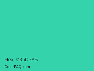 Hex #35d3ab Color is a normal cyan color and the nearest color is Eucalyptus #44d7a8. Hex code #35d3ab and RGB value is rgb(53,211,171). In RGB color space, this color is composed of 21% red, 83% green, 67% blue, In CMYK color space, this color is composed of 75% cyan, 0% magenta, 19% yellow , 17% black , In HSL color space, this color has a hue angle of 165° , 64% saturation and 52% lightness.