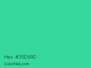 Hex #35d99d Color is a normal green color and the nearest color is Shamrock #33cc99. Hex code #35d99d and RGB value is rgb(53,217,157). In RGB color space, this color is composed of 21% red, 85% green, 62% blue, In CMYK color space, this color is composed of 76% cyan, 0% magenta, 28% yellow , 15% black , In HSL color space, this color has a hue angle of 158° , 68% saturation and 53% lightness.