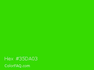 Hex #35da03 Color is a normal green color and the nearest color is Harlequin Green #46cb18. Hex code #35da03 and RGB value is rgb(53,218,3). In RGB color space, this color is composed of 21% red, 85% green, 1% blue, In CMYK color space, this color is composed of 76% cyan, 0% magenta, 99% yellow , 15% black , In HSL color space, this color has a hue angle of 106° , 97% saturation and 43% lightness.