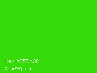 Hex #35da08 Color is a normal green color and the nearest color is Harlequin Green #46cb18. Hex code #35da08 and RGB value is rgb(53,218,8). In RGB color space, this color is composed of 21% red, 85% green, 3% blue, In CMYK color space, this color is composed of 76% cyan, 0% magenta, 96% yellow , 15% black , In HSL color space, this color has a hue angle of 107° , 93% saturation and 44% lightness.