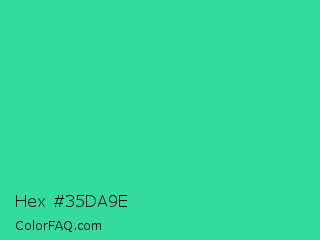 Hex #35da9e Color is a normal green color and the nearest color is Shamrock #33cc99. Hex code #35da9e and RGB value is rgb(53,218,158). In RGB color space, this color is composed of 21% red, 85% green, 62% blue, In CMYK color space, this color is composed of 76% cyan, 0% magenta, 28% yellow , 15% black , In HSL color space, this color has a hue angle of 158° , 69% saturation and 53% lightness.