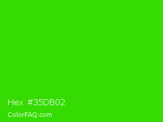 Hex #35db02 Color is a normal green color and the nearest color is Harlequin Green #46cb18. Hex code #35db02 and RGB value is rgb(53,219,2). In RGB color space, this color is composed of 21% red, 86% green, 1% blue, In CMYK color space, this color is composed of 76% cyan, 0% magenta, 99% yellow , 14% black , In HSL color space, this color has a hue angle of 106° , 98% saturation and 43% lightness.
