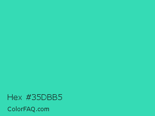 Hex #35dbb5 Color is a normal cyan color and the nearest color is Eucalyptus #44d7a8. Hex code #35dbb5 and RGB value is rgb(53,219,181). In RGB color space, this color is composed of 21% red, 86% green, 71% blue, In CMYK color space, this color is composed of 76% cyan, 0% magenta, 17% yellow , 14% black , In HSL color space, this color has a hue angle of 166° , 70% saturation and 53% lightness.