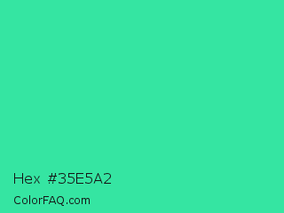 Hex #35e5a2 Color is a normal green color and the nearest color is Eucalyptus #44d7a8. Hex code #35e5a2 and RGB value is rgb(53,229,162). In RGB color space, this color is composed of 21% red, 90% green, 64% blue, In CMYK color space, this color is composed of 77% cyan, 0% magenta, 29% yellow , 10% black , In HSL color space, this color has a hue angle of 157° , 77% saturation and 55% lightness.